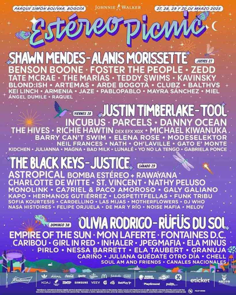 Shawn Mendes, Alanis Morissette, Benson Boone, Foster The People, Zedd, Tate Mcrae, The Marias, Teddy Swims, Kavinsky, Blond:ish, Artemas, Arde Bogotá, Clubz y más.