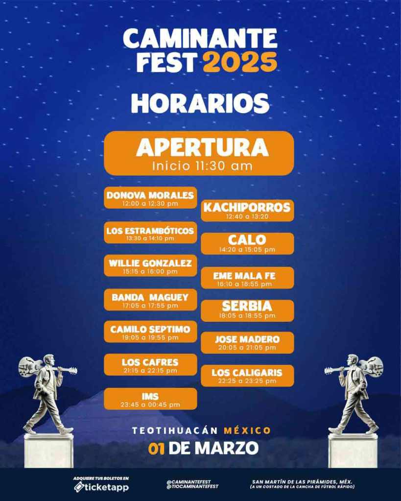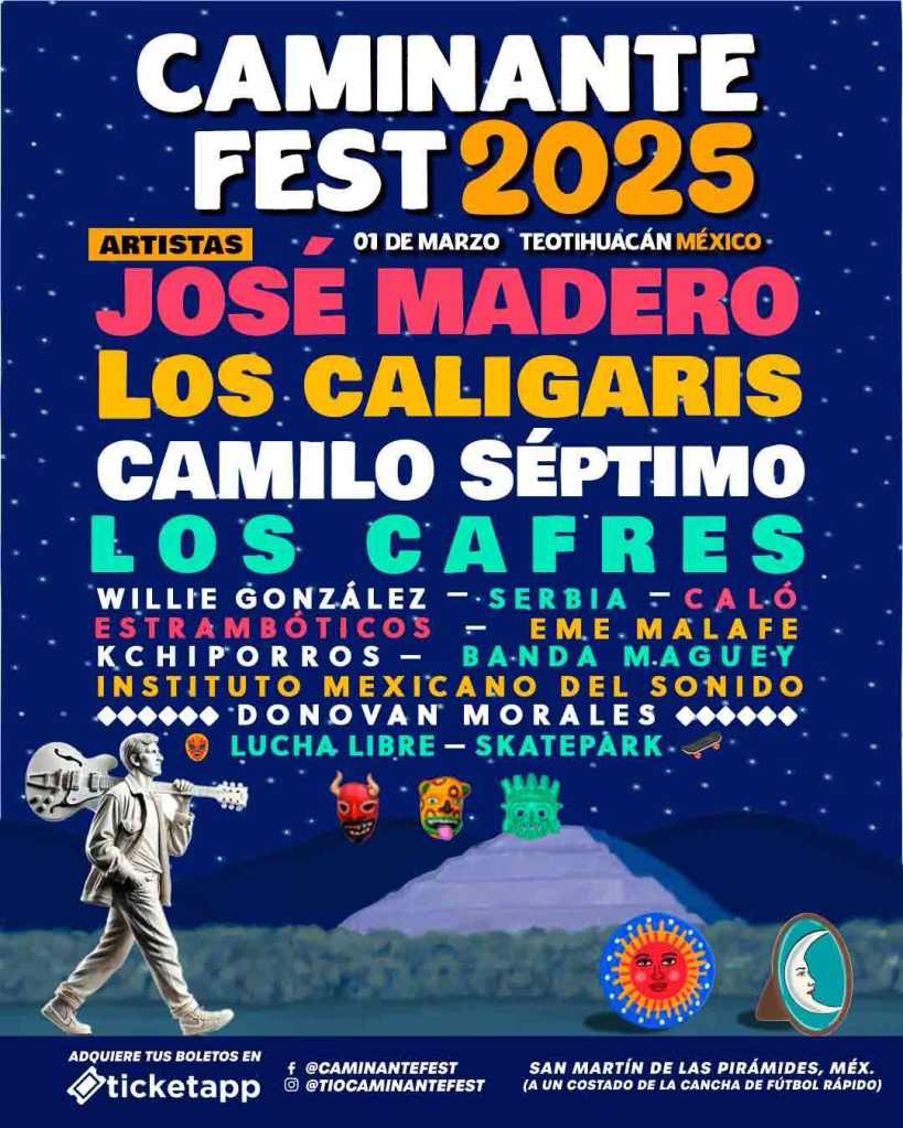 El Caminante Fest 2025 está listo para sorprender con un cartel espectacular y una experiencia única en un entorno inigualable. El sábado 1 de marzo, el festival reunirá a grandes exponentes de la música en las Pirámides de Teotihuacán, un sitio histórico que servirá de escenario para una jornada llena de energía, diversidad y emoción.