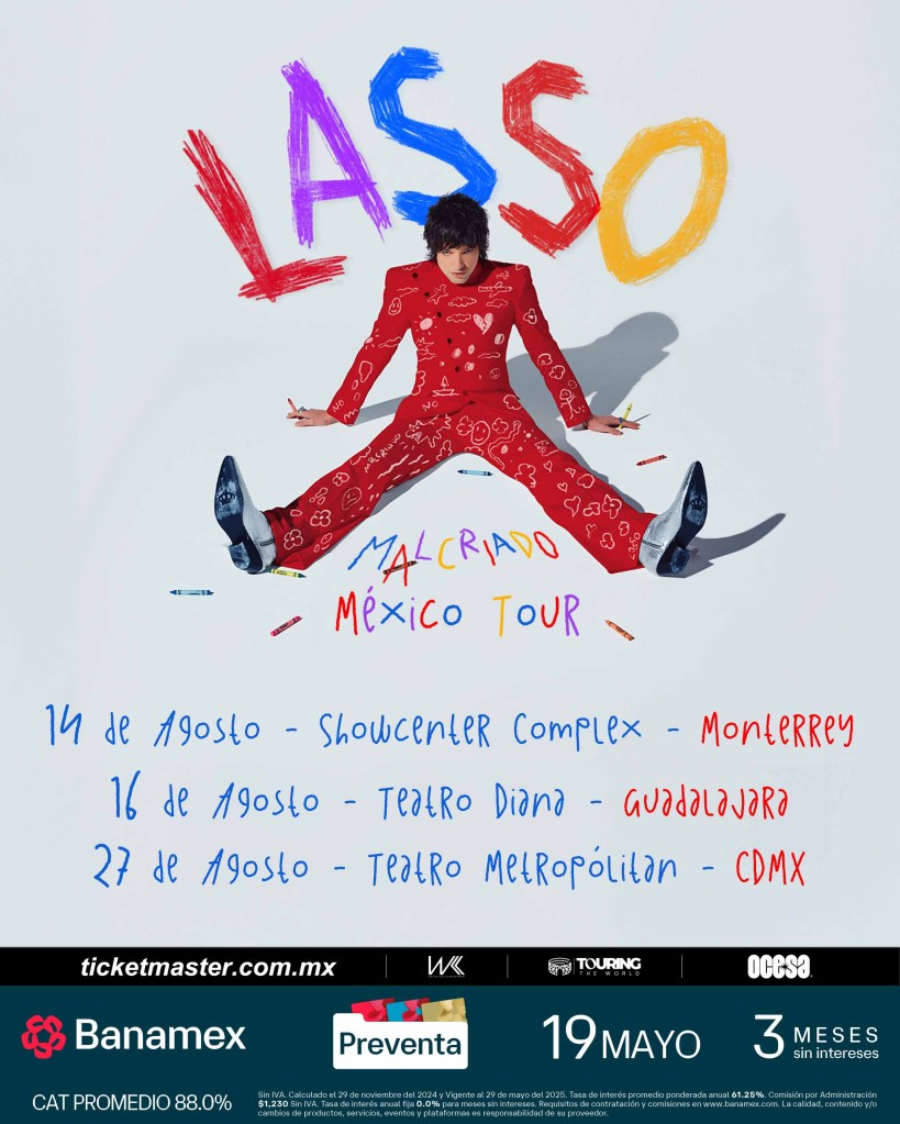 Después de un año lejos de los escenarios, Lasso vuelve con todo y el corazón lleno de nuevas canciones. El cantautor venezolano iniciará su esperado “Malcriado World Tour” en México, con cuatro fechas confirmadas en Monterrey, Guadalajara, Querétaro y Ciudad de México durante el mes de agosto de 2025.